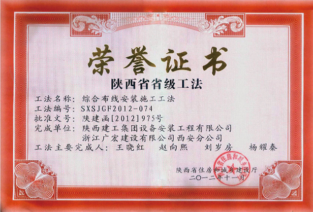 综合布线安装施工工法省级证书