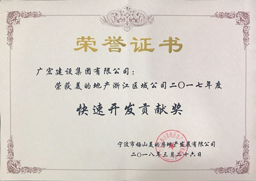 公司常务副总邵圆娟在受奖大会上说,广宏建设是美的地产的土建类集团战略商,在建的湖南区域各项目在美的第三方季评中名列前茅。2017年公司在浙江区域的宁波、金华、东阳等地承建了四个项目,美的授予我们浙江区域“2017年度快速开发贡献奖”,是对我们努力付出的肯定。同时,我们清醒地认识到,浙江区域的几个项目与湖南区域的几个项目在工程生产和管理上还存在着一定的差距。浙江是广宏建设的大本营,我们将再接再厉,进一步做好管理人员和班组的统一调配,加强美的地产第7版季检评比标准的学习和应用,采取各种方式让大家熟知并掌握最新的技术标准,争取在最短的时间达到位列美的地产在建项目前列。