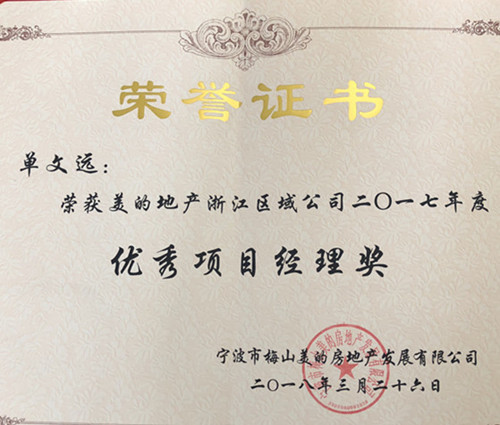 3月26日,在美的地产浙江区域召开的核心供应商年度大会上,公司获得美的地产浙江区域快速开发贡献奖。金华市君兰美邸住宅小区多湖项目部项目经理单文远获“优秀项目经理奖”。
