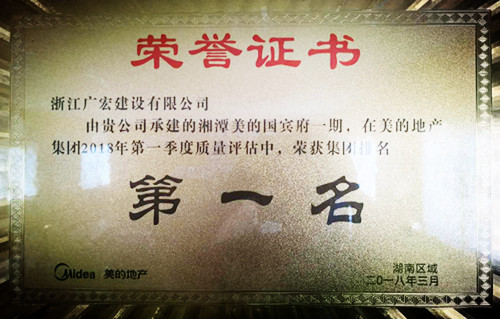 4月18日,湘潭美的国宾府项目经理郭国权高兴地从美的地产集团领导中接过“美的地产集团2018年第一季度质量评估集团第一名”的荣誉证书。