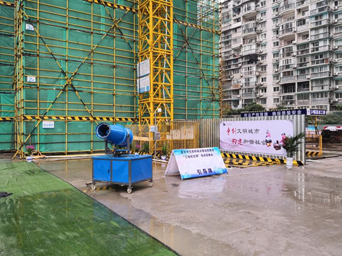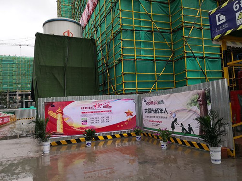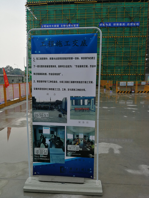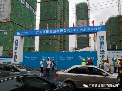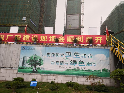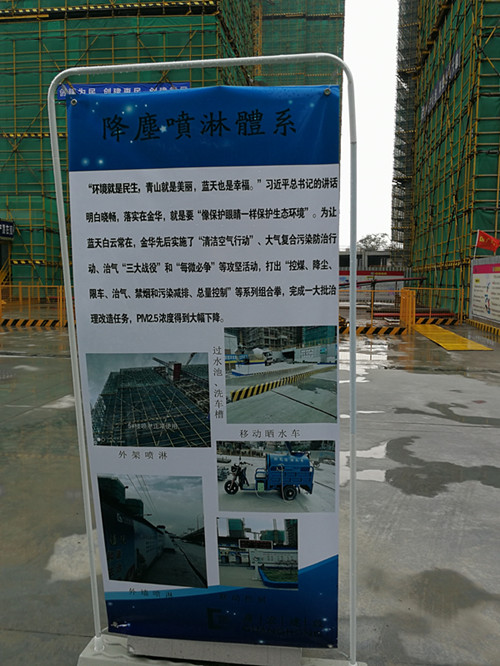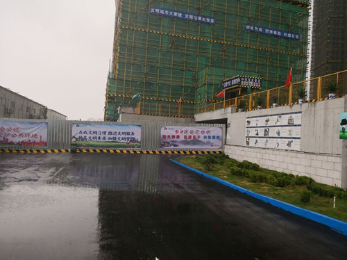 刘国强总经理说,美辰园项目位于双龙大桥西侧,面向金华江,地理位置十分优越,也是文明城市创建工作的重要展示窗口。作为项目施工单位,响应政府号召,做好创建文明工地责无旁贷。具体措施:一是统一思想认识。召开专题会议,明确提出,集团、各分公司、项目部务须树立主人翁意识,自觉履行主体职责,城市建设本身就是为了城市更美丽,决不能因建设而使城市一角有脏乱差、使广宏有污名;二是职责明确,督导有力。在市建设局、美的置业金华城市公司和监理单位的大力支持下,美辰园项目部多次召开管理人员、班组长等各个层面的会议,宣传落实创建工作,统一思想认识,制定相关措施,组建创建工作小组,对照《金华市创建全国文明城市建筑工地检查》20条标准,分解相关职责到每一位工程管理员、各班组、栋号长、饮事员和门卫保安。广宏一建专门派出专门督查员,长驻美辰园项目部具体负责“工地创建文明”的督导;三是突出重点,补齐短板。美辰园项目地处交通要道,周边商铺林立,可谓一寸土地一寸金。项目部一班人多次研究,商讨解决办法。坚持做到项目部围档不占用人行道,坚持裸露地面全部硬化;坚持防治扬尘和噪音不余力遗,不惜花费一百多万元,购置雾炮机械、空气联动系统、空气质量监测、五枪一球视频监控设置,做到楼栋外架喷淋,塔吊喷淋,围墙喷淋等“三喷淋”,入口专人负责冲洗车辆,严格设立污水三级沉淀池,最大限度地降低建筑扬尘和噪音和水环境。为充分营造金华市创建全国文明城市的良好氛围,在面向大桥的楼栋的墙面上,制作了5块长18米、宽12米,充满正能量的巨大公益广告牌,让每位经过双龙大桥上的金华市民和外地来客都能感受到金华创建文明城市的信心。此外,在工地围墙和工地内墙上,均张贴了社会主义核心价值观等公益广告,让美辰园的员工每天感受到满满的正能量。