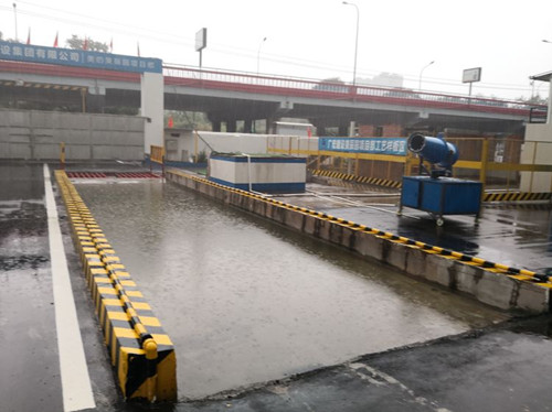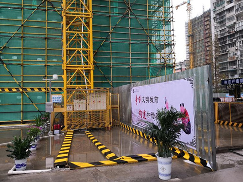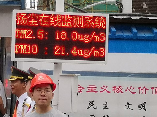 设在大门外的扬尘在线监测,与脚手架~围墙降尘系统联动