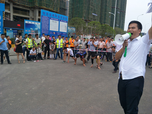 株洲美的翰城项目部彩旗和五色气球迎风飘扬。红色地毯从门口一直铺到舞台。在两幢在建楼中间搭建了一个近千平米的观众席。