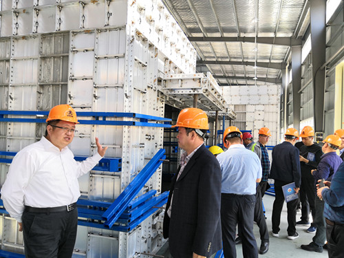 在浙江建恒建筑科技有限公司铝模生产厂间,贾天法经理向来宾介绍了铝模的生产工艺、技术优势和使用、安装方法。