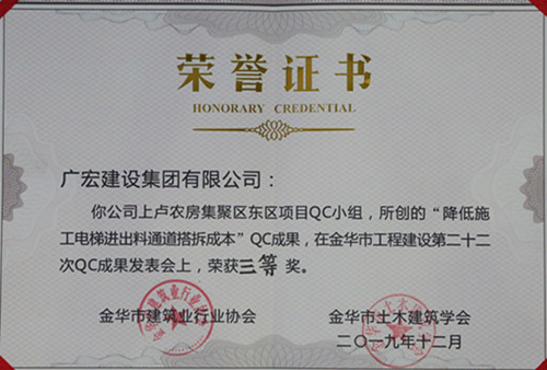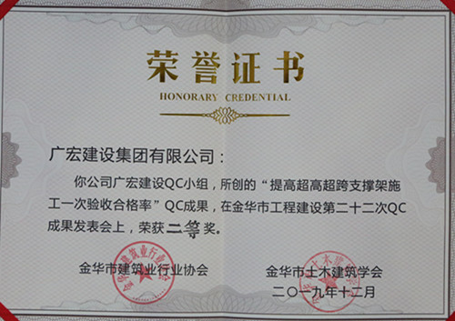 成果三: 多项QC成果发表,获得金华市级多个奖项。由总工室人员编写与创作的“提高超高超跨支撑架施工一次验收合格率”QC成果,在金华市工程建设第二十二次QC成果发表会上荣获二等奖,并推荐参加省级QC成果发表。由上卢农房集聚区项目人员编写与创作的“降低施工电梯进出料通道搭拆成本”QC成果获三等奖,由上卢农房集聚区东区项目人员编写与创作的“提高墙柱根部混凝土成型质量”QC成果和阜阳美的城项目人员编写与创作的“提高剪力墙成型质量合格率”QC成果分别获得“发表奖”。
