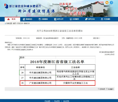 成果一:《贝雷架平台支模施工工法》荣获“省级工法”。由总工室组织编写的《贝雷架平台支模施工工法》,经过多方协作配合与持之以恒不懈努力,省市建设主管部门组织评审与公示,确认为“2018年度浙江省省级工法”。