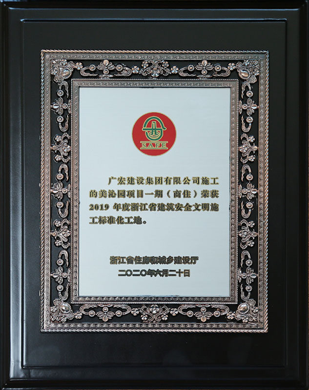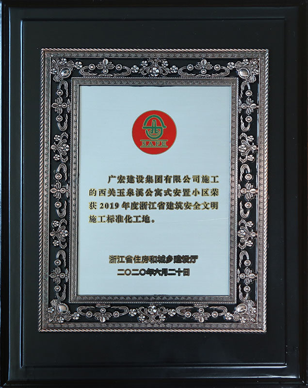 今天,广一建区域公司从浙江省住房与城乡建设厅领取了“2019年度浙江省标化工地”奖牌。其区域内的“西关玉泉溪公寓式安置小区”、“美沁园项目一期”项目双双荣获“2019年度浙江省标化工地”荣誉。
