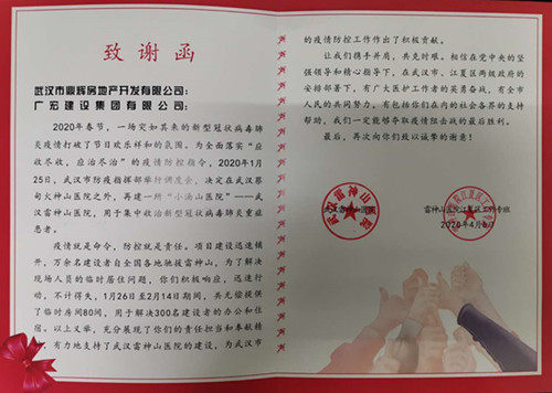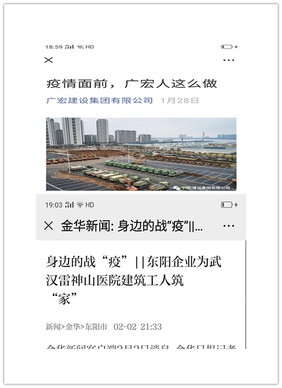 1月26日,武汉决定建设雷神山医院,刘国强总经理当即电令广宏二建和武汉君兰半岛项目部全力做好雷神山医院建设的后勤工作,君兰半岛项目部腾出全部生活区和600余张床位,为武汉雷神山医院建设者筑“家”。留守项目人员每天为建设者提供开水、消毒、测量体温等后勤服务。1月29号得知医院建设还缺少部分特种技术工人,紧急招募38名焊接工和机修工直接参与雷神山医院建设。对此番广宏人的善举,《建筑时报》、《金华日报》、《金华新闻网》、《杭州新闻网》、《东阳新闻网》等在第一时间予以报道,雷神山医院发了特别致谢函。