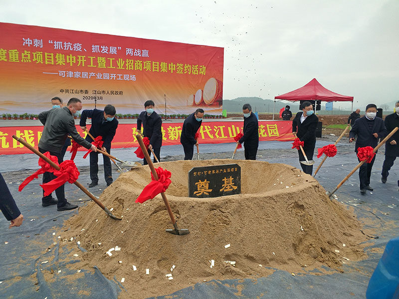 江山市委书记童炜开工仪式上对科润高端装备产业园等10个招商项目签约表示祝贺,并宣布“江山市一季度可津家居产业园等32个重点项目集中开工”。