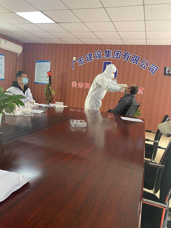 3月6日,迪安诊断公司专业人员带着试剂盒等相关设备如约来到项目部,对28名管理人员逐一进行咽拭子取样,提取的咽拭子由迪安诊断公司带回检测室检测。次日,28名管理人员的核酸检测报告如期报送到项目部。检测结果全部阴性。
