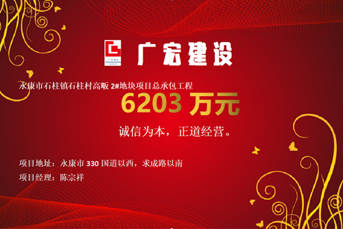 2021年6月25日,由华鸿嘉信实施的“永康市石柱镇石柱村高畈2#地块”项目总承包工程,广宏一举中标。该项目合同金额6203万元,总工期639日历天。