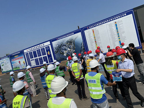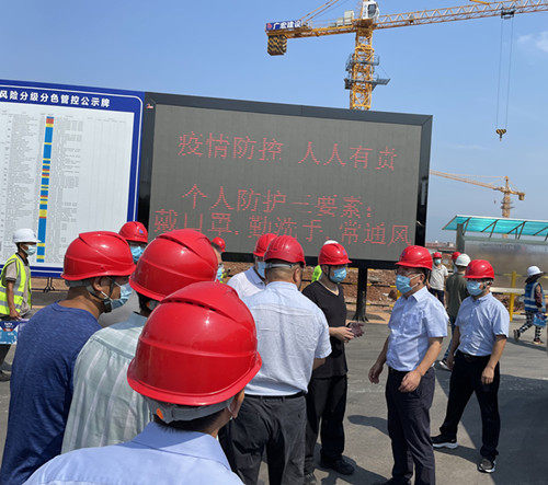 宋志恒主席等一行一边听取胡华楠总经理汇报项目智能化+红色工地创建、工程生产进展、进场施工员工的动态化管理和疫情防控工作措施,一边进行了实地察看,对项目施工进展和疫情防控工作表示肯定。