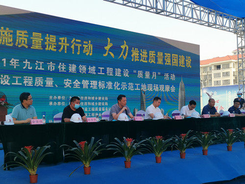 九江市住房和城乡建局调研员叶青就下步工作作了部署。他说,在春华秋实的日子里,在市第十二次党代会召开之际,我们在可津·海棠湾项目召开住建领域工程建设“质量月”活动暨工程建设质量、安全标准化示范工地现场观摩会,是全面贯彻深入实施质量提升行动,大力推进质量强市建设的重要内容。我们要以“党建+”引领,构筑质量新阵地;以“五化协同”,助力质量强市建设;以标准示范,树立质量管理新标杆;以精细化管理,打造质量管理新精品;以信息化支撑,建设质量管理新平台。同时,要切实维护群众正当权益,正视问题,补齐短板,在把握形势任务中增强使命自觉。攻坚克难,同心戮力,开创我市住建事业跨越式发展新局面。