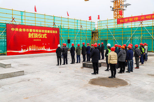 2022年1月7日上午,中共金华市委党校新校园建设项目内耸立的大楼主体被“封顶大吉”的大红幅和一条条红色祝福标语装点得格外喜庆!伴随着最后一方混凝土的浇筑到位, 在各参会领导的见证下,由我公司承建的“中共金华市委党校新校园建设项目”主体工程提前20天顺利封顶。市委党校常务副校长杨寿根,市城投集团党委书记、董事长毛世梁,广宏建设集团有限公司总经理刘国强等其他相关领导及参建单位人员参加了封顶仪式。