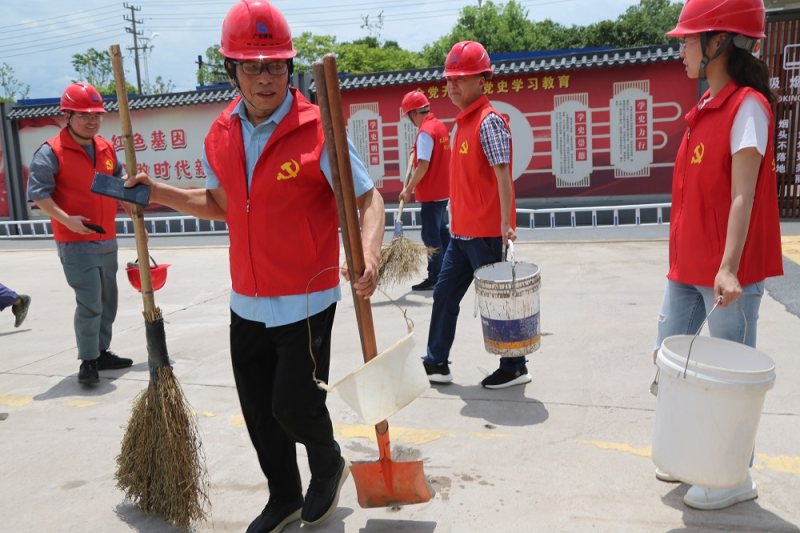 6月30日,金华市委党校临时党支部开展了政治理论学习,并于正午时分,党员们身穿红马甲,带头在工地生产一线清理废弃建筑垃圾、生活垃圾。