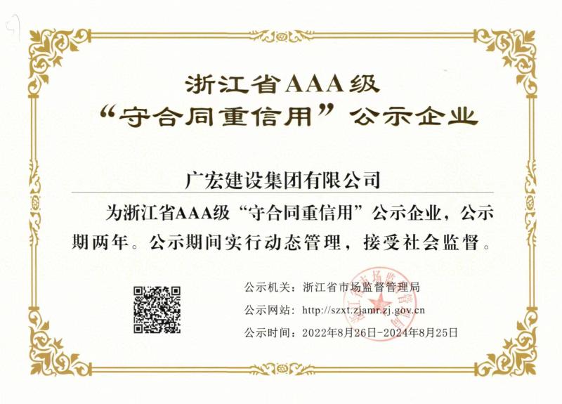 日前,浙江省市场监督管理局公示了2022年浙江省AAA级“守合同重信用”企业名单,广宏建设凭借着诚信守法的“契约精神”、多年来良好的社会信誉和优质的管理服务,顺利通过严格的审核程序,再次被评定为省AAA级“守合同重信用”企业。