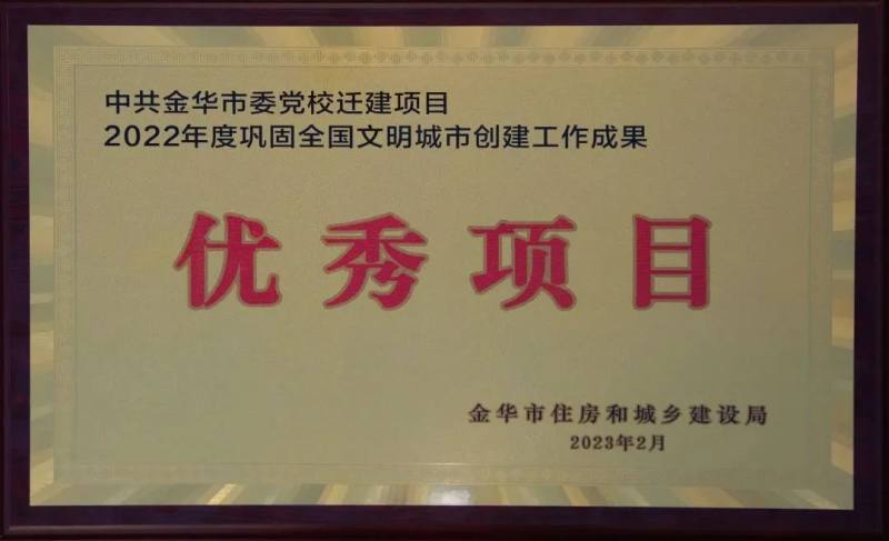 在金华市住房和城乡建设局召开的全国文明城市创建工作会议上,对创建成效突出并具有示范作用的先进企业和优秀工地进行了表彰,公司获评金华市2022年度巩固全国文明城市创建工作成果先进企业,由公司承建的中共金华市委党校迁建项目获评金华市2022年度巩固全国文明城市创建工作成果优秀项目。