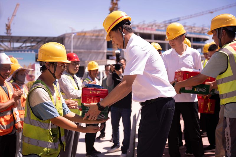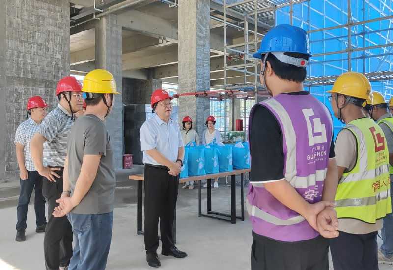 7 月 22 日上午,东阳市委书记楼琅坚、市领导郭锦明、赵跃亮、黄阳明,及市委办、总工会主要领导一行,亲临广宏建设集团承建的东阳市文化艺术中心项目现场,开展高温慰问。市文广旅体局、市城投集团相关领导参加,市文化艺术中心项目指挥部常务副指挥长葛一军、广宏建设集团总经理刘国强等相关负责人陪同。楼琅坚书记一行亲手将防暑降温用品送到工人手中,对一线建设者的坚守付出表示感谢和敬意,叮嘱他们注意防暑降温、做好自我防护,并嘱咐施工单位合理安排作业时间,做好高温天气下的安全生产工作。