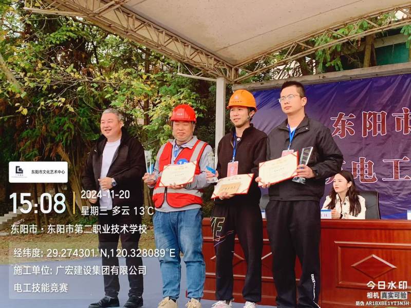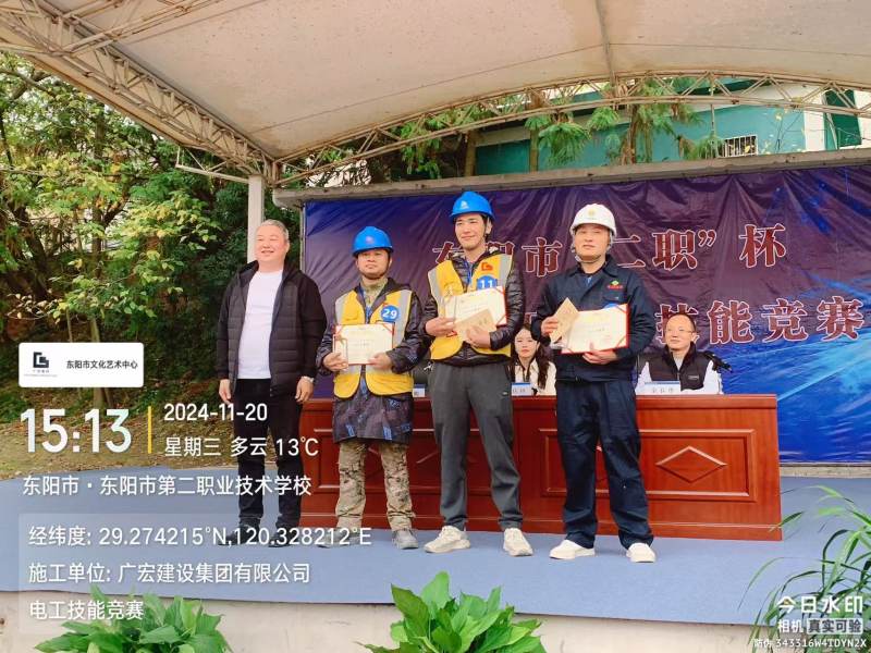 11月20日,由东阳市住房和城乡建设局、东阳市建筑业发展服务中心主办,东阳市职教中心二职校区承办的2024年东阳市“二职”杯建筑电工职业技能竞赛在东阳市职教中心二职校区举行。经过激烈的实际操作和理论比赛,由肖路生、任阳阳、朱海峰组成的“广宏建设代表队”,荣获团体比赛三等奖;在个人奖项中,肖路生和任阳阳均获得个人三等奖。