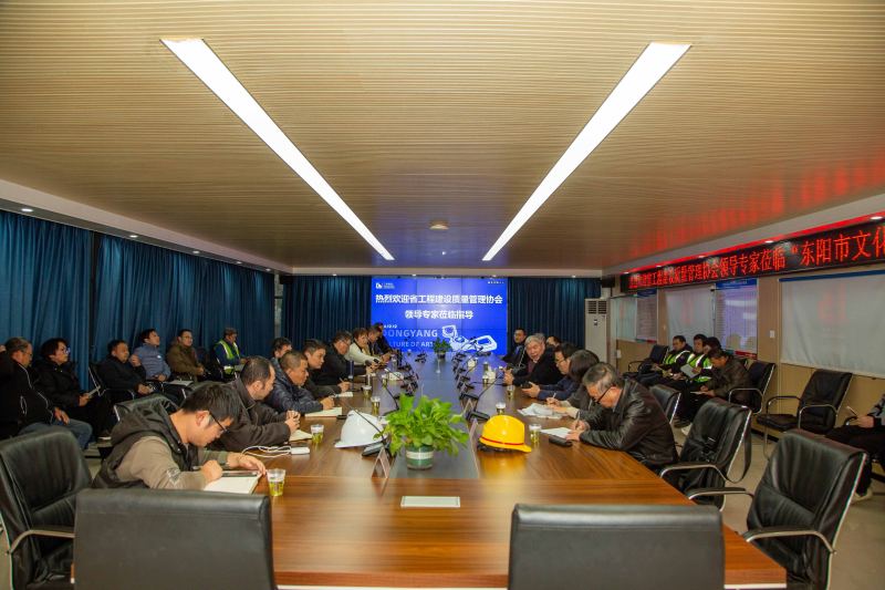 12月12日下午,浙江省工程建设质量管理协会会长朱永斌、副会长兼秘书长胡庆红、副会长常德强等领导及专家叶军献、邓刚、毛国伟一行莅临东阳市文化艺术中心项目实地检查指导,为项目全力备战中国建设工程鲁班奖提供专业指导与评估。东阳市住房与城乡建设局局长、党委书记韦健,总工程师陈红亮、东阳市建筑业发展服务中心主任吴康、广宏建设集团总经理刘国强、总工程师陈建兰及参建单位相关负责人全程陪同。
