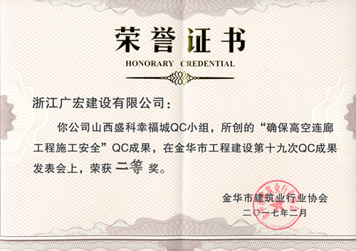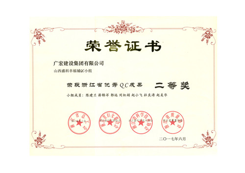 2017年6月27日到30日,集团总工室携广宏建设集团有限公司山西盛科幸福城QC小组活动成果《确保高空连廊工程施工安全》参加了由浙江省质量协会等联合举办的二〇一七年浙江省优秀质量管理小组成果发布会,最终荣获浙江省优秀QC成果二等奖。