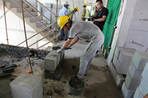 12时半,十七组砌体选手在工作人员的引导下,来到41幢2-3层,进行砌筑比赛,时间也是3小时。