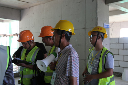 12时半,公司总经理助理何国栋率裁判组人员从墙面平整度、墙面垂直度、方正性、阴阳角方正等9个方面对17位粉刷工进行评定打分;从立杆间距、垂直度、步距、扣件螺栓拧紧、扭力矩值等10个方面对17位架子工进行评定打分,从垂直度、表面平整度、观感质量等11个方面对17位砌筑工进行评定打分。