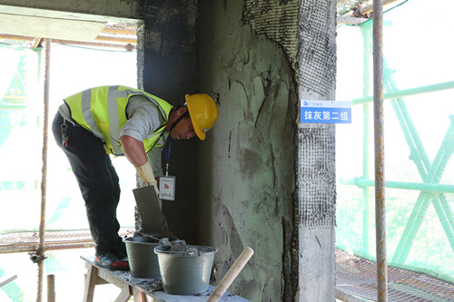 上午9时,粉刷工和架子工两个工种首先开始实际操作比赛。粉刷的比赛场地位于41幢楼4-5层,各组选手按照抽签序号在自己的施工场地上按照比赛要求进行粉刷抹灰。比赛时间为3小时。