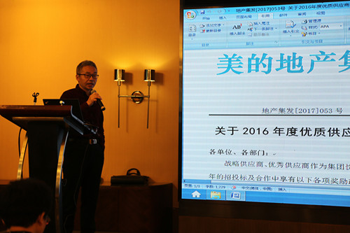 上午8:30培训开始。美的集团总部工程管理中心副总监朱石健从美的地产的发展情况、全国布局、近期战略、工程品质提升总体战略、工程管理提升计划、工程人员的天职、管理平台的主要任务、工程师文化、四级管控体系、品质评估等13个方面详解了《美的地产工程管理》;从新工艺体系、装修房战略、装修管理等4个方面讲解了《新工艺体系工程》。