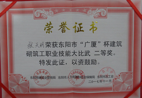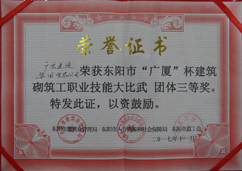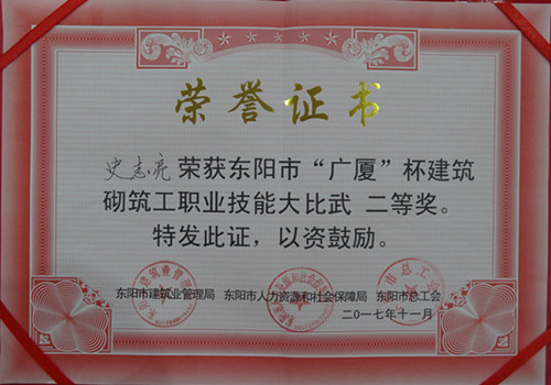 日前,由东阳市建筑业管理局、东阳市人力资源和社会保障局和东阳市总工会联合举办的东阳市“广厦”杯建筑砌筑工职业技能大比武在广厦学院举行。我公司选送的张天明(技工)、史志亮(技工)、张影(辅工)组成的团队获得团队三等奖、张天明、史志亮获个人二等奖。史志亮曾在公司首届职工技能大比武中获得砌筑工工种第三名。